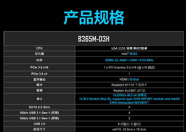 商品名称:圣旗 B365M-D3H主板(Intel B365/LGA 1151) 支持7.8.9代处理器